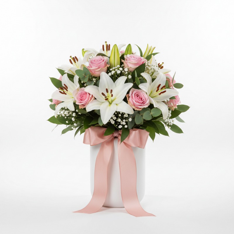 Özel günleriniz için tasarlanmış Zarafet Buketi, beyaz lilyum ve pembe güllerin uyumlu dansını sunar. Sevdiklerinize şıklığı ve tazeliği aynı anda hediye edin. Her ortama zarafet katacak bu aranjmanla unutulmaz anlar yaşatın.